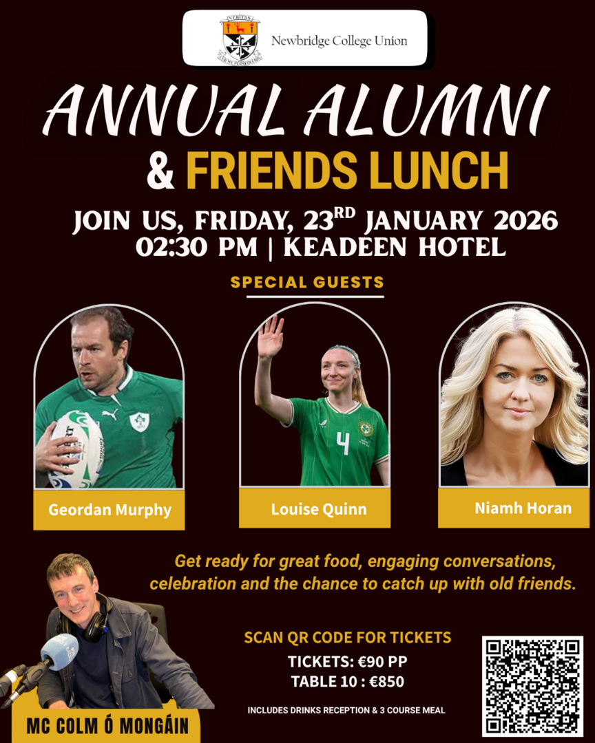 Join us at the Newbridge College Union Lunch on Friday January 23, 2026 at 2:30 PM a day filled with reminiscing, laughter, engaging conversations and celebration. Our MC on the day is Colm Ó Mongáin RTE Broadcaster , and special Guests Geordan Murphy (Former Irish Rugby Player), Louise Quinn (Former Irish Footballer) and Niamh Horan (Sunday Independent Journalist). Get your tickets today! Drinks Reception and 3-course meal included! Tickets can be purchased HERE